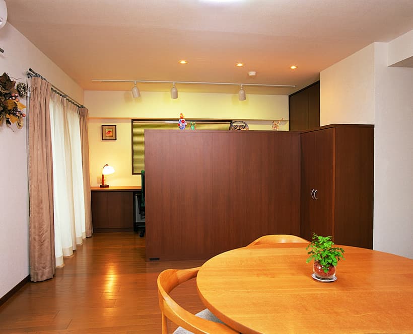ご主人の仕事するスペースが必要な為、和室をリビングの続きとしてその一部にワーキングコーナーを設けることにした。間仕切りを兼ねた収納で狭さを感じさせず仕切られた空間を作ることにした。