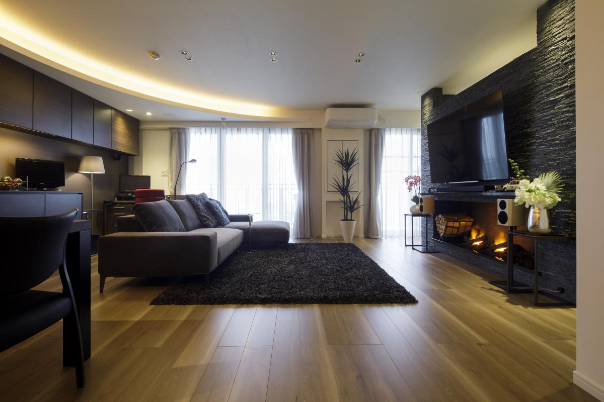 リビングには電気暖炉のあるシンボルウォールを設置。そのシンボルウォールを境として、空間による「ハレ」と「ケ」、動線による「ハレ」と「ケ」を設定。また照明はすべてダウンライトと間接照明で統一。調光によって灯りの「ハレ」と「ケ」を使い分けました。さらに、天井を含め各所にスピーカーを配しています。