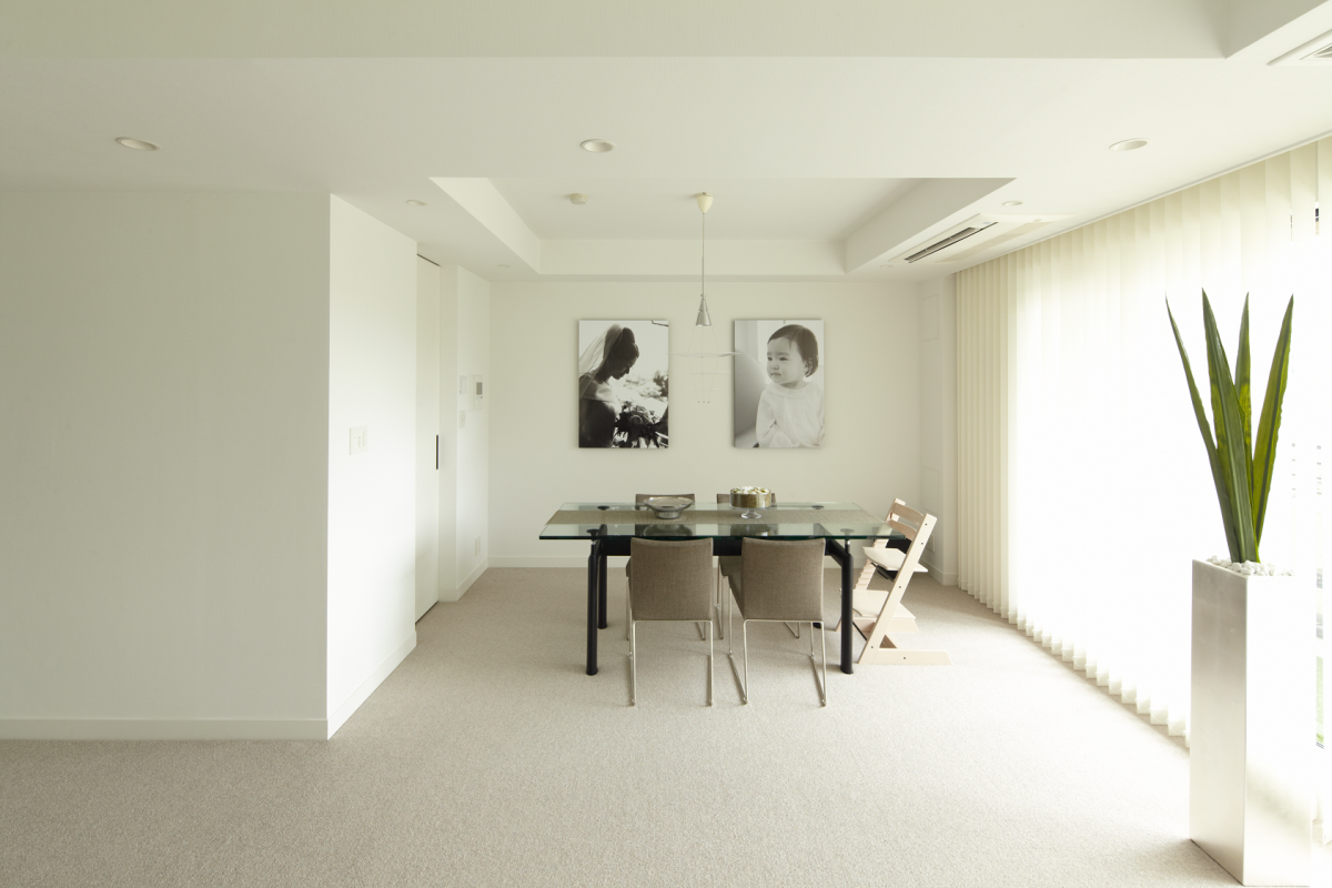 リビング・ダイニング Living & dining room 白とグレーを基調とした空間に、観葉植物の鮮やかなグリーン。インテリアはグレー、アクセントカラーはブラックに。 足下では、ベージュのカーペットが柔らかな印象を与えます。 一部屋分の洋室を取り除き、余分なせり出しをなくしたリビングは、外光もたっぷり。 まるでホテルのラウンジのように明るく、広がりのある空間へと一新しました。 リビングと子供部屋、廊下は同じベージュのカーペットで連続感、統一感をもたせて。またガラス戸も、その向こうの廊下と一体感を出しつつ、明確な間仕切りとなっています。 将来、お子様がプライバシーを求める年ごろになったときにも対応できるよう、引き戸は一般的なものよりも重く厚いものにしました。 照明を、埋込タイプのダウンライトにして天井は高く、すっきりと。 厚みをもたせた壁でキッチンを独立させ重厚感と非日常の空間を演出。 コメント&データ Comments & data 施主コメント リフォームの目的と要望 広いリビングと、そこに続く子供部屋を作りたい 設備を新しいものに交換したい 細部まで好みの家にしたい 設備やデザインを一方的に押し付けられるのでなく、設計や営業担当者と一緒につくりあげていくリフォームができました。 BEFORE AFTER DATA リフォーム部位 性能向上:快適・床暖房 間取り変更 リビング・ダイニング Living & dining room キッチン Kitchen 浴室・洗面脱衣室 Bathroom トイレ Toilet 収納・ウォークインクローゼット Closet 間取り変更 Plan changing リフォームの動機・目的 性能向上:快適・床暖房 間取り変更 リビング・ダイニング Living & dining room キッチン Kitchen 浴室・洗面脱衣室 Bathroom トイレ Toilet 収納・ウォークインクローゼット Closet 間取り変更 Plan changing 実例の所在地 東京都 築後年数 14年 リフォーム費用 非公開 リフォーム工事期間 3ヶ月