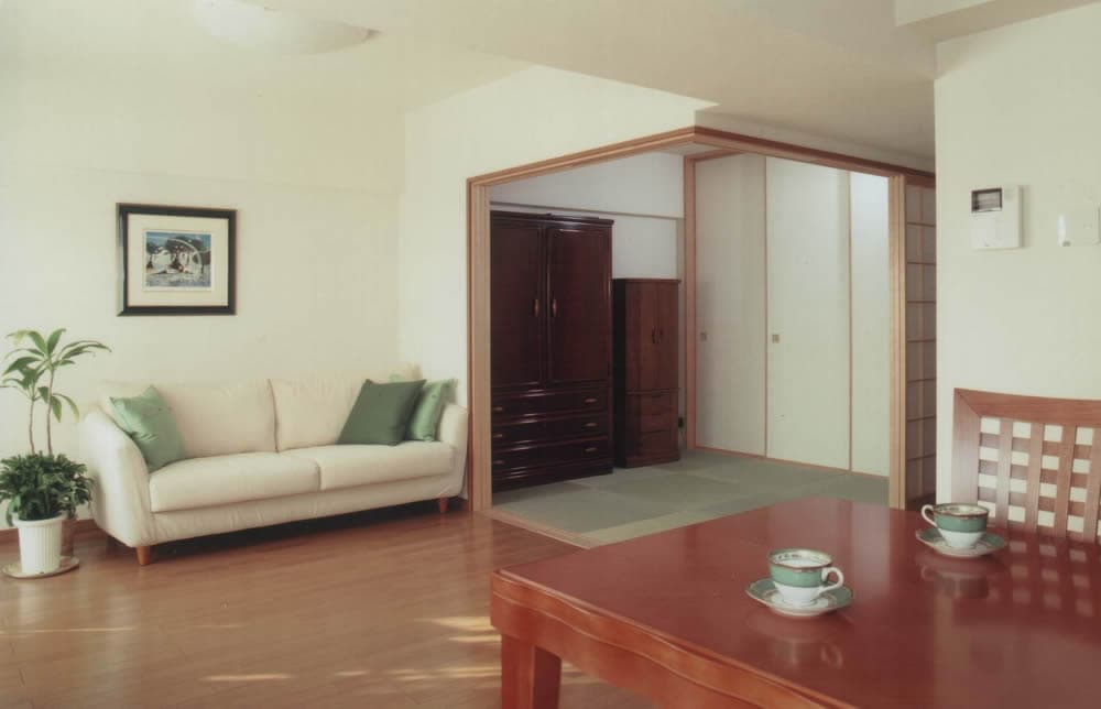 和室を残すことを希望されていましたので、専用のスペースをとるのではなく、リビングの一角にコーナーとして配置し開放感のある空間にしました。来客時の宿泊にも使えるよう引き込み式の建具を備えています。