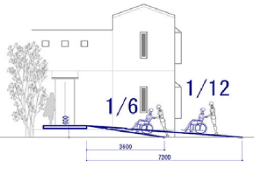 1/12勾配の自走式車椅子対応スロープは高低差がある場合は長くなる。