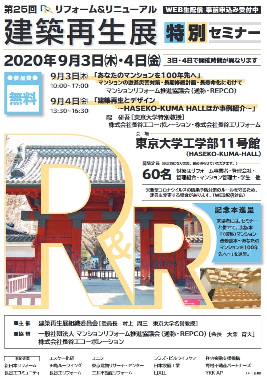 新型コロナウイルスの感染拡大により会場である東京大学工学部11号館の使用が困難となったため、建築再生展組織委員会(主催者)はセミナーの開催を中止し、来年度に延期となりました。 マンション管理組合・マンション管理士・リフォーム事業者の方向けに、「第25回R&R建築再生展2020・特別セミナー」を東京大学工学部11号館(HASEKO-KUMA HALL)にて開催いたします。 例年開催されているR&R建築再生展はオリンピックの影響で2020年度の開催は延期されましたが、管理組合の皆様への情報発信を継続するため、例年高い評価をいただいている「REPCO管理組合向けセミナー」を9月3日(木)に開催致します。また、9月4日(金)は、セミナー会場のリノベーションのデザインをされた建築家の隈 研吾氏による講演会等を開催致します。なお、セミナー参加者には、同セミナーの開催に合わせて出版を予定している『マンション改修読本』を無料進呈いたします。 参加ご希望の方は、建築再生展事務局まで申込をお願いします。